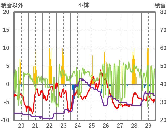 | 日 | 時 | 気温 | 降水 | 風向/風速 | 日照 | 積雪 | 降雪 |