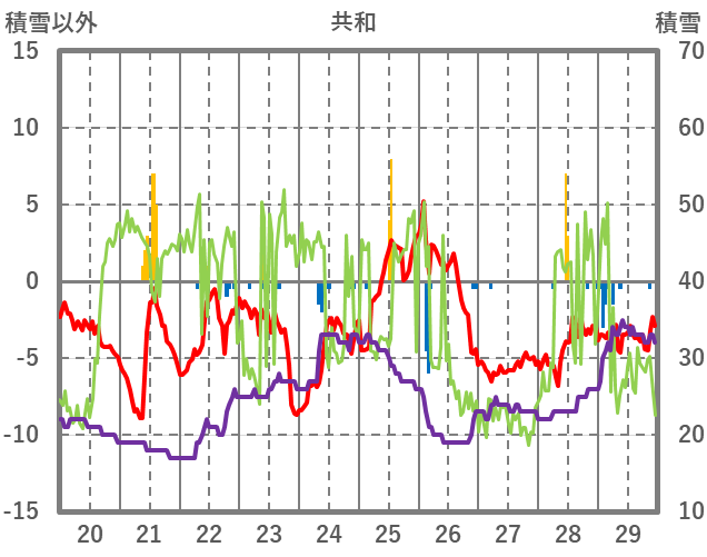 | 日 | 時 | 気温 | 降水 | 風向/風速 | 日照 | 積雪 | 降雪 |