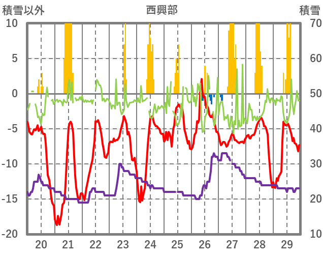 | 日 | 時 | 気温 | 降水 | 風向/風速 | 日照 | 積雪 | 降雪 |