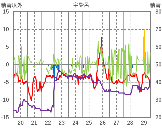 | 日 | 時 | 気温 | 降水 | 風向/風速 | 日照 | 積雪 | 降雪 |