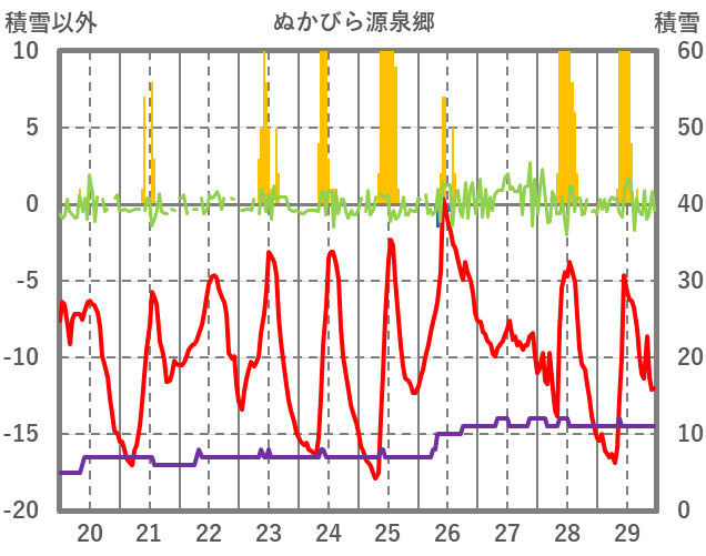 | 日 | 時 | 気温 | 降水 | 風向/風速 | 日照 | 積雪 | 降雪 |