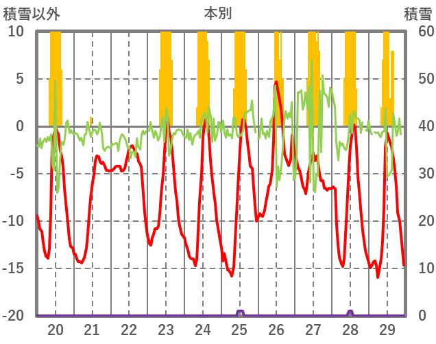 | 日 | 時 | 気温 | 降水 | 風向/風速 | 日照 | 積雪 | 降雪 |