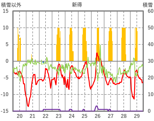 | 日 | 時 | 気温 | 降水 | 風向/風速 | 日照 | 積雪 | 降雪 |