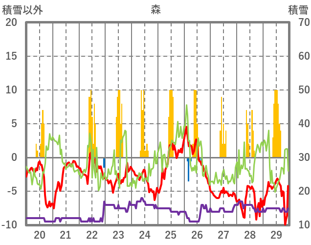 | 日 | 時 | 気温 | 降水 | 風向/風速 | 日照 | 積雪 | 降雪 |