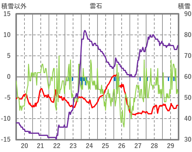 | 日 | 時 | 気温 | 降水 | 風向/風速 | 日照 | 積雪 | 降雪 |