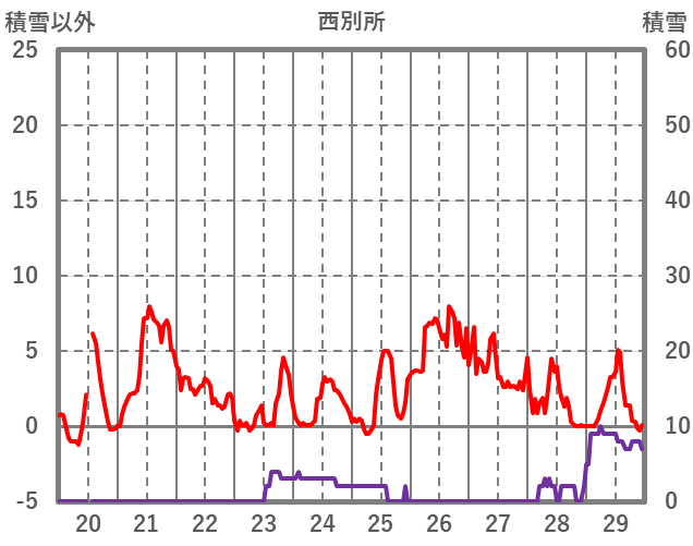 | 日 | 時 | 気温 | 降水 | 風向/風速 | 日照 | 積雪 | 降雪 |