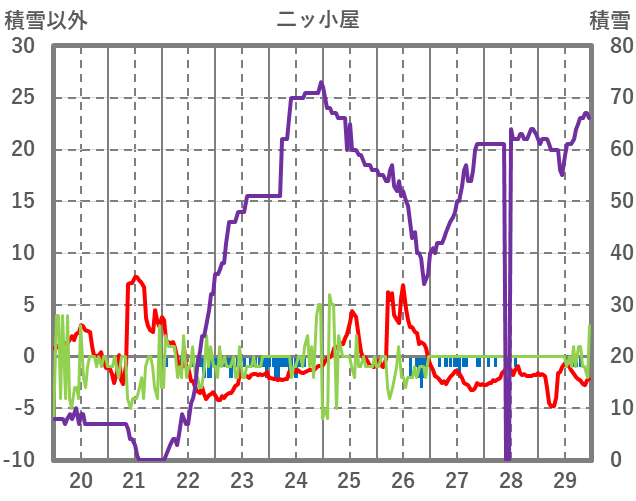 | 日 | 時 | 気温 | 降水 | 風向/風速 | 日照 | 積雪 | 降雪 |