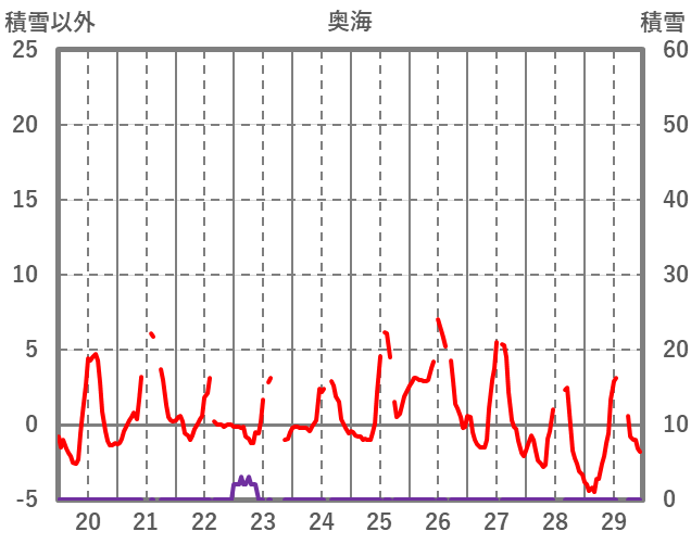 | 日 | 時 | 気温 | 降水 | 風向/風速 | 日照 | 積雪 | 降雪 |