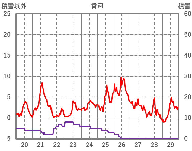 | 日 | 時 | 気温 | 降水 | 風向/風速 | 日照 | 積雪 | 降雪 |
