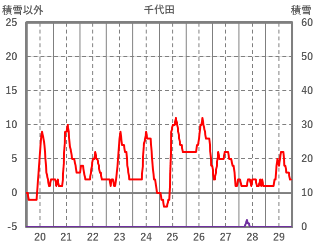 | 日 | 時 | 気温 | 降水 | 風向/風速 | 日照 | 積雪 | 降雪 |