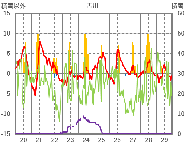 | 日 | 時 | 気温 | 降水 | 風向/風速 | 日照 | 積雪 | 降雪 |