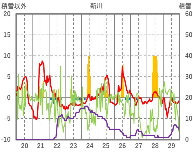 | 日 | 時 | 気温 | 降水 | 風向/風速 | 日照 | 積雪 | 降雪 |
