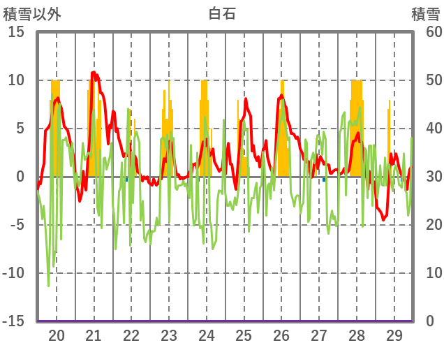 | 日 | 時 | 気温 | 降水 | 風向/風速 | 日照 | 積雪 | 降雪 |