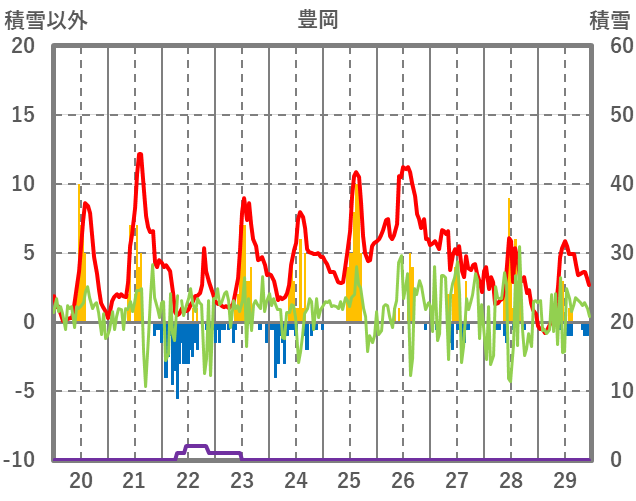 | 日 | 時 | 気温 | 降水 | 風向/風速 | 日照 | 積雪 | 降雪 |
