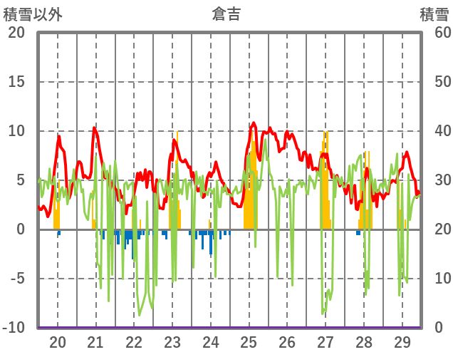 | 日 | 時 | 気温 | 降水 | 風向/風速 | 日照 | 積雪 | 降雪 |