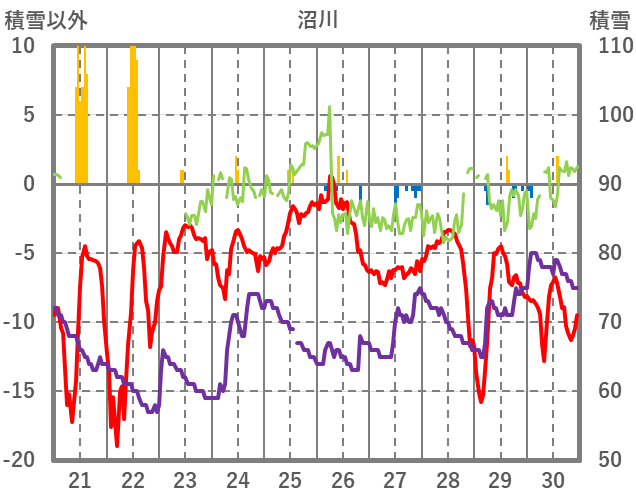 | 日 | 時 | 気温 | 降水 | 風向/風速 | 日照 | 積雪 | 降雪 |