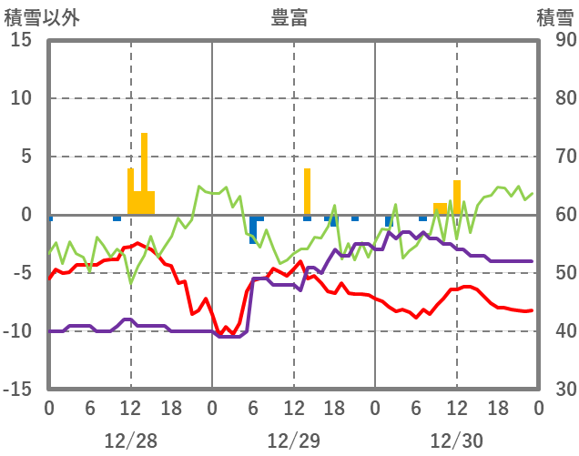 | 日 | 時 | 気温 | 降水 | 風向/風速 | 日照 | 積雪 | 降雪 |