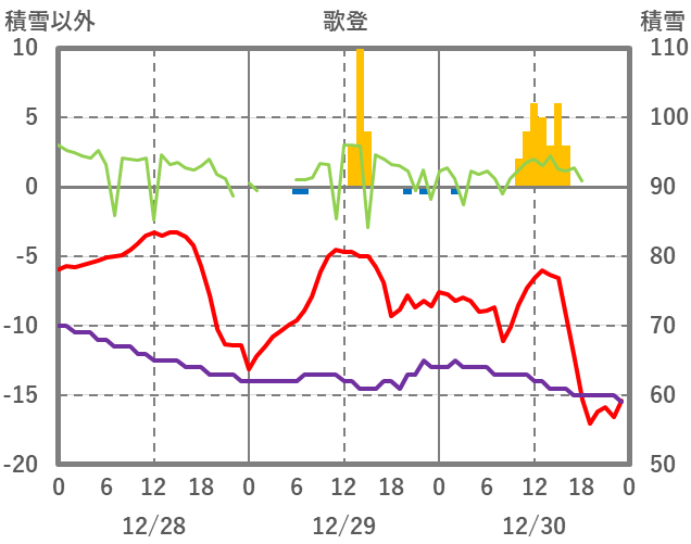 | 日 | 時 | 気温 | 降水 | 風向/風速 | 日照 | 積雪 | 降雪 |