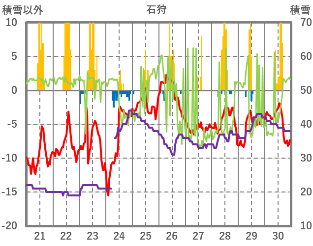 | 日 | 時 | 気温 | 降水 | 風向/風速 | 日照 | 積雪 | 降雪 |
