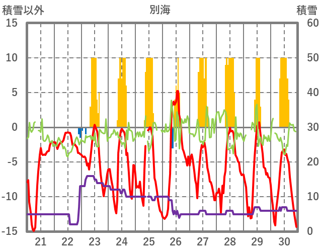 | 日 | 時 | 気温 | 降水 | 風向/風速 | 日照 | 積雪 | 降雪 |