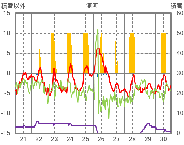 | 日 | 時 | 気温 | 降水 | 風向/風速 | 日照 | 積雪 | 降雪 |