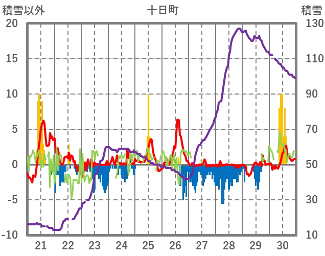| 日 | 時 | 気温 | 降水 | 風向/風速 | 日照 | 積雪 | 降雪 |