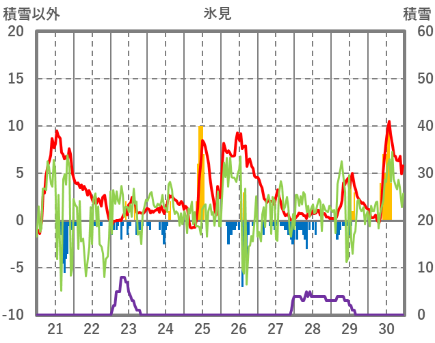 | 日 | 時 | 気温 | 降水 | 風向/風速 | 日照 | 積雪 | 降雪 |