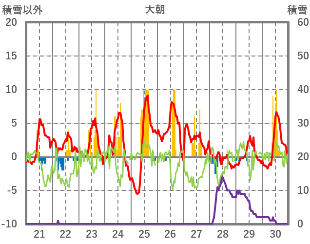 | 日 | 時 | 気温 | 降水 | 風向/風速 | 日照 | 積雪 | 降雪 |