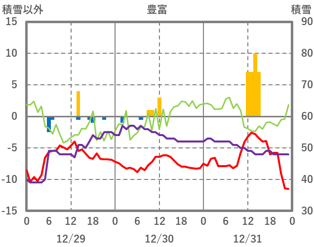 | 日 | 時 | 気温 | 降水 | 風向/風速 | 日照 | 積雪 | 降雪 |