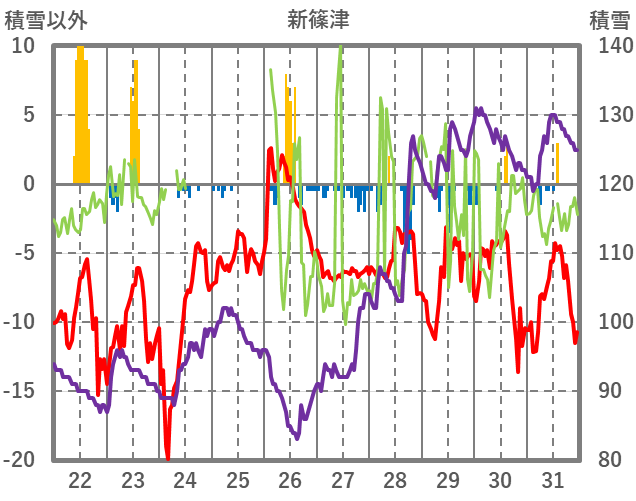 | 日 | 時 | 気温 | 降水 | 風向/風速 | 日照 | 積雪 | 降雪 |
