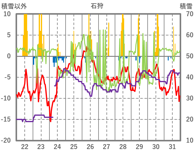 | 日 | 時 | 気温 | 降水 | 風向/風速 | 日照 | 積雪 | 降雪 |