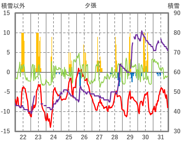 | 日 | 時 | 気温 | 降水 | 風向/風速 | 日照 | 積雪 | 降雪 |
