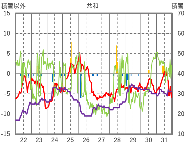 | 日 | 時 | 気温 | 降水 | 風向/風速 | 日照 | 積雪 | 降雪 |