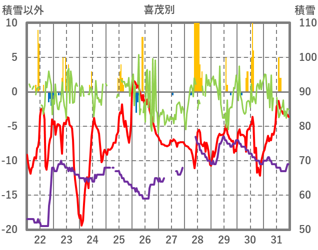 | 日 | 時 | 気温 | 降水 | 風向/風速 | 日照 | 積雪 | 降雪 |
