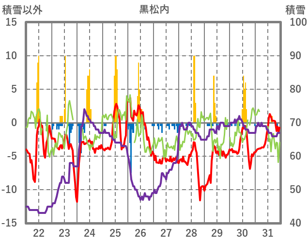 | 日 | 時 | 気温 | 降水 | 風向/風速 | 日照 | 積雪 | 降雪 |