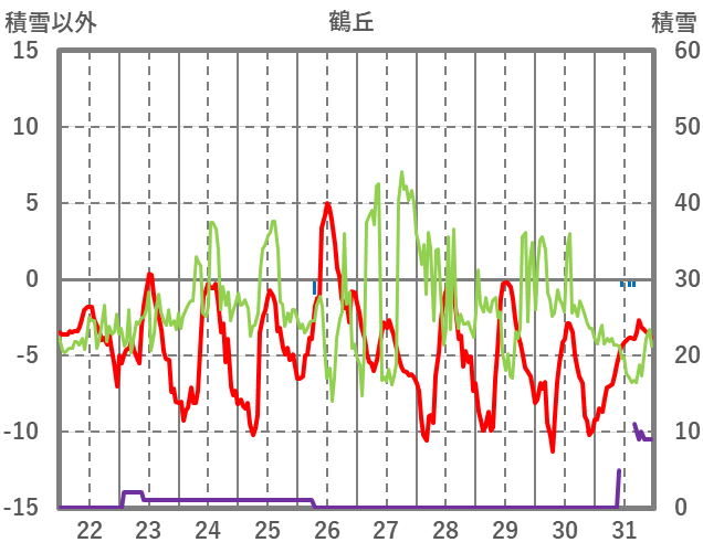 | 日 | 時 | 気温 | 降水 | 風向/風速 | 日照 | 積雪 | 降雪 |