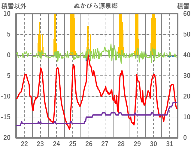 | 日 | 時 | 気温 | 降水 | 風向/風速 | 日照 | 積雪 | 降雪 |