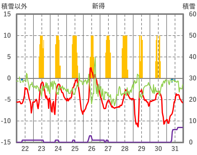 | 日 | 時 | 気温 | 降水 | 風向/風速 | 日照 | 積雪 | 降雪 |