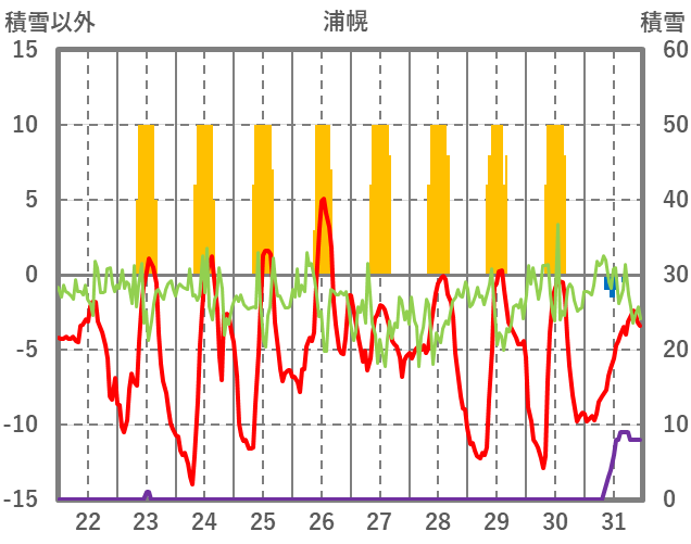 | 日 | 時 | 気温 | 降水 | 風向/風速 | 日照 | 積雪 | 降雪 |