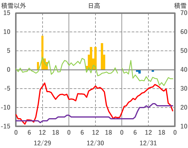 | 日 | 時 | 気温 | 降水 | 風向/風速 | 日照 | 積雪 | 降雪 |
