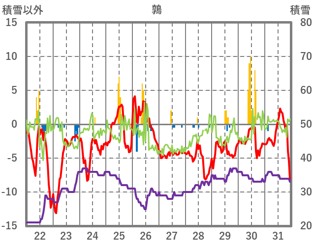 | 日 | 時 | 気温 | 降水 | 風向/風速 | 日照 | 積雪 | 降雪 |