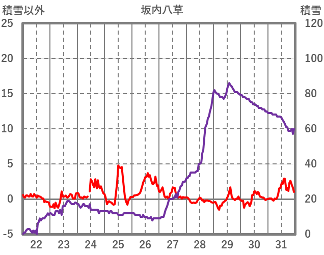 | 日 | 時 | 気温 | 降水 | 風向/風速 | 日照 | 積雪 | 降雪 |
