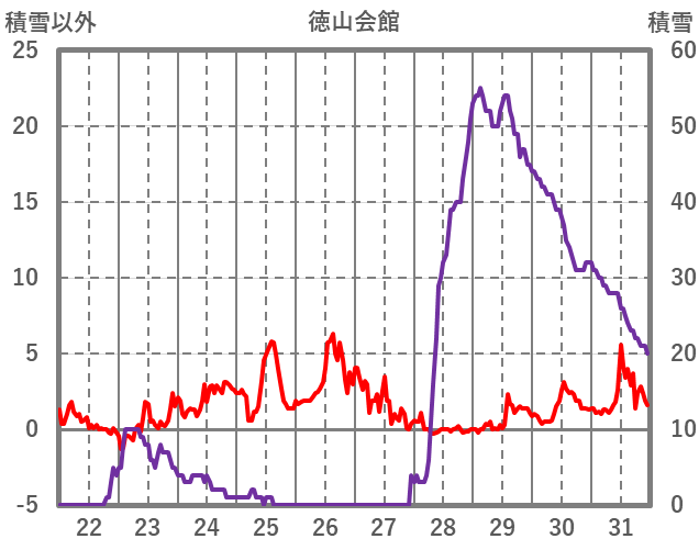 | 日 | 時 | 気温 | 降水 | 風向/風速 | 日照 | 積雪 | 降雪 |