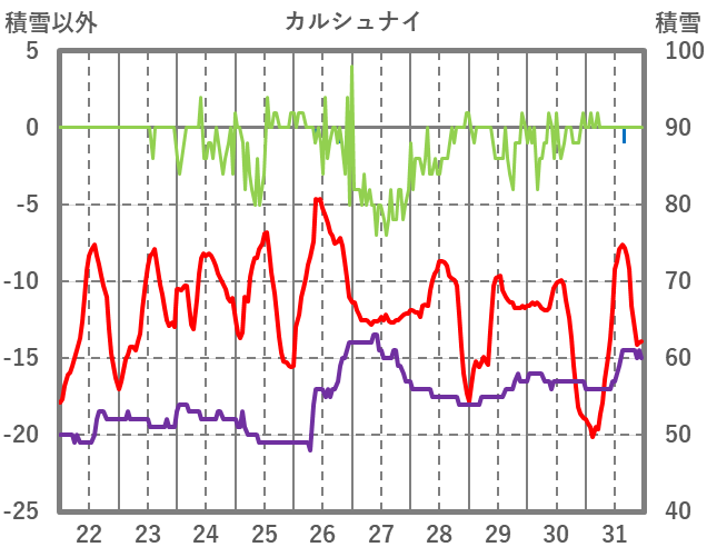 | 日 | 時 | 気温 | 降水 | 風向/風速 | 日照 | 積雪 | 降雪 |