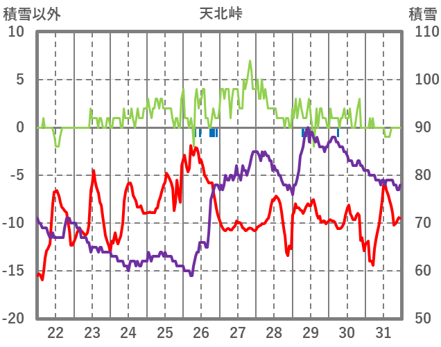 | 日 | 時 | 気温 | 降水 | 風向/風速 | 日照 | 積雪 | 降雪 |