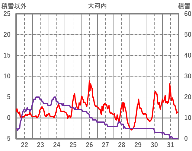 | 日 | 時 | 気温 | 降水 | 風向/風速 | 日照 | 積雪 | 降雪 |