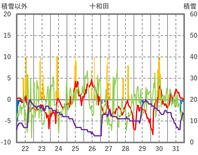 | 日 | 時 | 気温 | 降水 | 風向/風速 | 日照 | 積雪 | 降雪 |