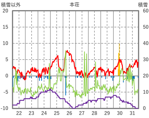 | 日 | 時 | 気温 | 降水 | 風向/風速 | 日照 | 積雪 | 降雪 |