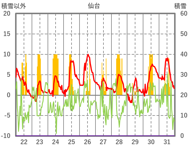 | 日 | 時 | 気温 | 降水 | 風向/風速 | 日照 | 積雪 | 降雪 |