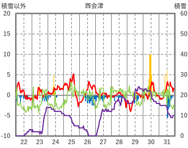 | 日 | 時 | 気温 | 降水 | 風向/風速 | 日照 | 積雪 | 降雪 |